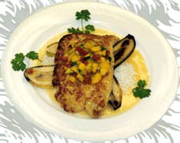 Place 2 oz. Beurre Blanc on bottom of plate. In center of plate, place 1 cup mold of rice. Place 2 pieces of banana, criss cross over rice. Place snapper on top of the bananas. Top snapper with 1 tbsp. fruit salsa. Garnish with cilantro sprig.