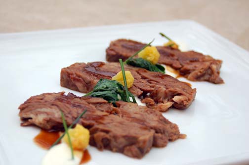 Place the short braised ribs on a serving plate. Place cauliflower, spinach and potato silk between each rib. Place glazed Fond dé Veau over the ribs for the final touch. Serve.