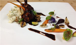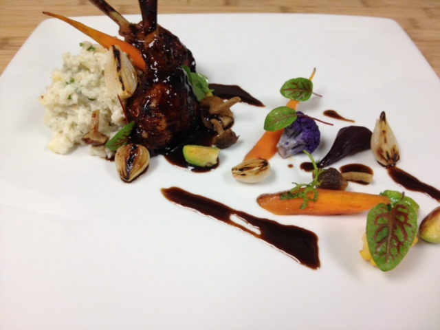 Once vegetables, grits, and chicken are done, arrange all components on a plate. Use fresh herbs or micro greens for garnish and enjoy!