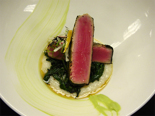 Heat a cast iron pan over medium/high heat. Add a small amount of vegetable oil and sear the tuna on all sides wrapped in the nori (about 1 minute per side). Remove tuna from pan and place in warm oven to keep warm. Mince the remaining ginger and sauté with the blanched spinach and a little butter until warm. Combine the radishes, scallions, sesame oil, sesame seeds, and the remaining rice wine vinegar. Season with salt and set aside.