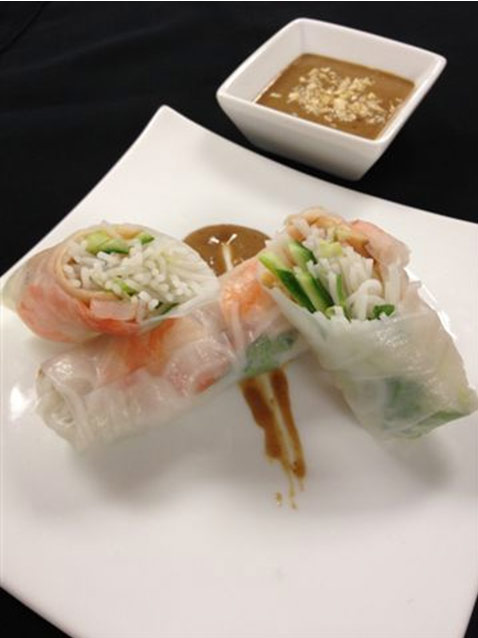 Heat oil in a pot and add garlic, then tomato paste and cook for a minute or two on medium-high heat. Add the remaining ingredients, bring to a boil while whisking to combine. Reduce the heat to a simmer and cook for a few minutes. Remove from heat and allow sauce to cool down. Serve the peanut sauce on the side with toasted chopped peanuts sprinkled on top as a dipping sauce for the rice paper rolls. |