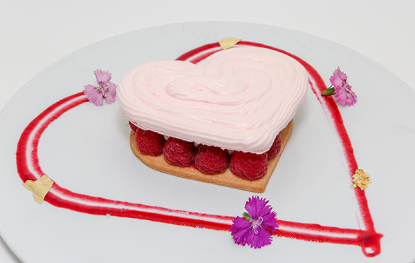 Raspberry Sauce Ingredients: 1 cup fresh raspberries 1/3 cup sugar Preparation: Place raspberries and sugar in a pot. Bring to a boil then turn down heat to a simmer and cook for 5 minutes. Strain out seeds and cool. To Build Dessert: Take cookie base and line outside of cookie with fresh raspberries. Pipe vanilla whipped cream around inside edge of raspberries. Fill inside of whipped cream with raspberry jam. Then pipe whipped cream on top of raspberry jam. Top with meringue heart. Before placing the dessert on plate, make a design with raspberry sauce that will be underneath. Then place a dot of whipped cream on plate to hold the dessert and place dessert on top. |