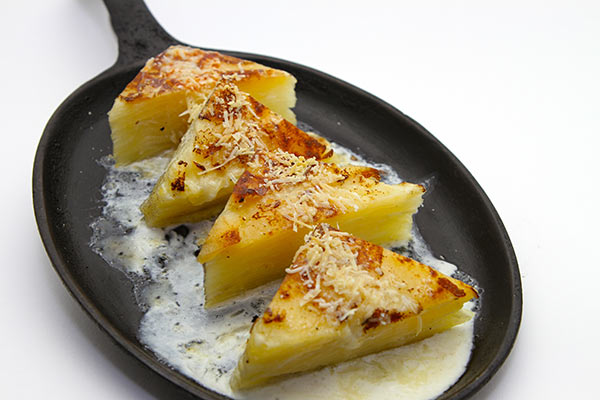 Preparation: When all of the potatoes have been sliced and the slices are submerged in the heavy cream, prepare the baking pan. Brush a common bread loaf pan with just enough of the softened butter to help the parchment paper adhere to the pan. Line the pan with the parchment paper leaving a 5-inch overhang on all four sides. The “small” sides should be done first with 1 large long piece; followed by the "long" sides, again with 1 long piece. Brush parchment paper with remaining softened butter and sprinkle with salt and pepper. After the potatoes are fully cooked remove the pan from oven and let cool for 15 minutes on a baking rack. Cut a piece of cardboard slightly smaller than the size of pan; wrap with aluminum foil and then a double wrap of plastic. Place the piece of cardboard on top of potatoes and weigh down to press the potatoes. You should see a SMALL amount of cream seep from the edges but you should not feel as you have “wrung” them out of all of their moisture.The idea is to press them to be firm after they have cooled completely, yet still be moist after they have been reheated. Let potatoes cool to room temperature. Remove weights and tightly wrap pan with the cardboard still in place. Refrigerate potatoes at least 6 hours or up to 2 days. Heat a large skillet over medium-high heat; add enough oil to coat. When oil is hot, add potatoes, cut-side-down, until the potatoes turn golden brown. Turn the pave in the pan so that the other cut side is now in the oil. Place the pan in a 375°F oven for approximately 7 minutes or until the pave his hot. Transfer to a platter and serve immediately.