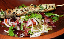 On a plate, place the mix greens in the center. Place the tuna skewer diagonal across the plate. Serve.