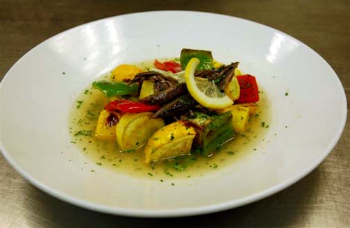 Preheat oven to 375°. Toss diced vegetables in olive oil with chopped parsley, garlic and season with salt and pepper. Roast them in the oven until golden brown, approximately 7 minutes. Meanwhile, heat some olive oil in a small sauté pan and sear the sardines.