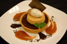 Place the garnished tart in the center of a serving plate. Decorate the plate with chocolate, caramel and chopped nuts of your choice. Serve.