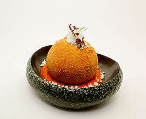 Place the diced low moisture mozzarella encapsulated with the sliced Munster Cheese in the center of the risotto ball and roll the risotto again to seal in the cheese.
