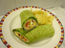 5. Roll tortilla and cut on bias for service.