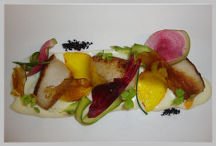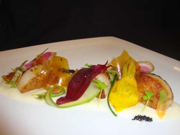 To plate this dish, place a spoonful of creamed leek potatoes down on the plate and drag the spoon toward yourself. Place the seared scallops directly down the middle of the potatoes. Take the tossed arugula and place small bunches on top of each scallop.