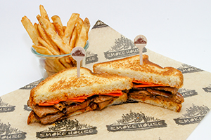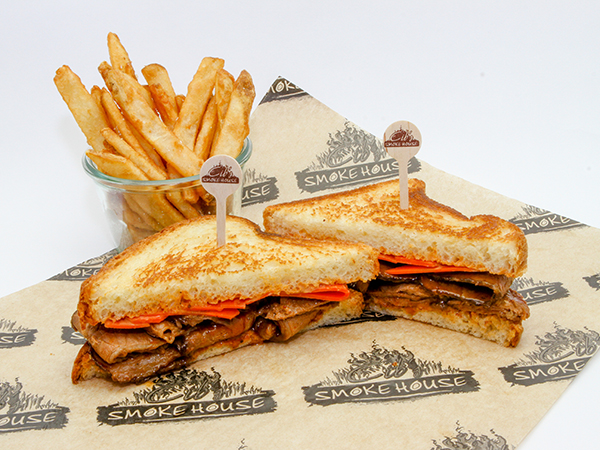 Slice garlic brioche, spread with garlic butter mixture and toast until golden brown. Thinly slice the warm brisket and toss with barbecue sauce. Spread pommery mayonnaise onto bread bottom slice of bread. Place brisket on sandwich. Top with pickled carrot and lettuce. Spread tomato fondue mixture onto top slice of bread. Serve immediately.