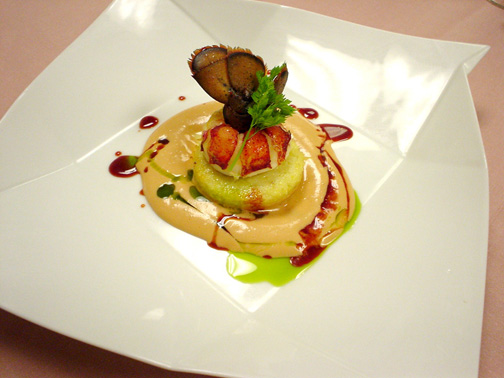 Dissolve 2 tablespoons chicken base in two cups of water and set aside to later be used as poaching liquid. Cut lobster tails in half, length-wise. Gently pull meat out of the shell, keeping meat intact. Cut the shell where the meat and tail meet, to keep them connected. Place meat flat on table with the sliced side down. Pull the tail end around to meet the meatiest end, forming a circle. Twist the tail so that it stands straight up, and fan it out. Place lobster tournedos into a sauté pan. Add enough chicken broth to cover lobster meat and poach on medium-low heat until lobster is fully cooked.