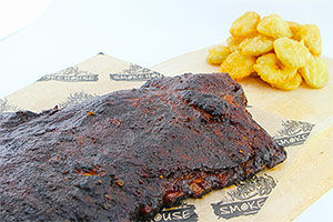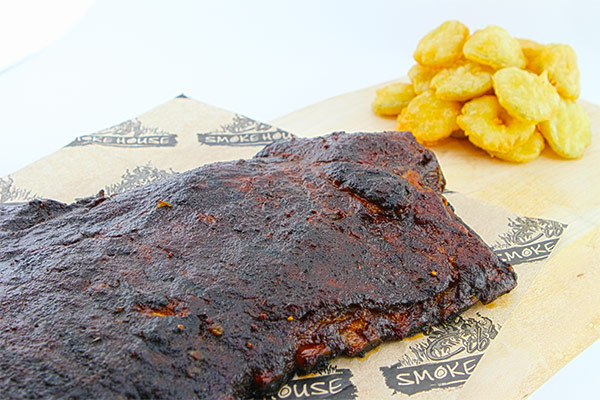 Preheat your smoker to 225°F with your choice of hardwood (preferably apple wood and hickory). Once your smoker has come to temperature, place in the smoker and cook for 4 hours. After the 1st hour, begin mopping the ribs every 30 minutes until the 4 hour mark has been reached. After 4 hours, remove from the smoker. Place on a cookie sheet, wrap with plastic wrap and rest for 30-45 minutes. At this point, the ribs are complete and can be grilled or served as is with your favorite BBQ sauce.