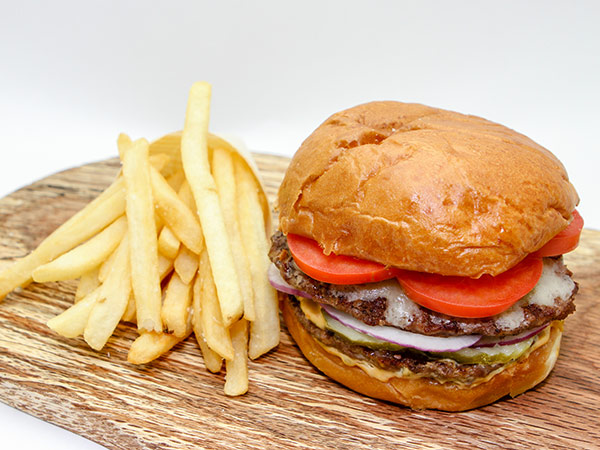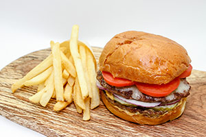 Spread the “secret” sauce on the bun bottom. Place the other patty on the bun. Spread a small amount of the “secret” sauce on the burger patty. Next, cover the patty with the sliced pickles and sliced red onion rings. Top with first patty and add the sliced Roma tomatoes. Finish with the toasted bun. Serve immediately.