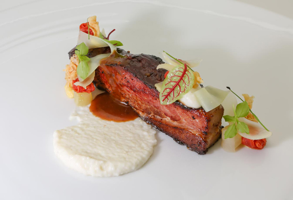 Follow recipe for pork collar as stated. Once collar is cooked, slice and serve. If you must cool and reheat then reheat in a pan with a rack underneath with additional veal stock and apple juice. Wrap pork collar in plastic wrap then tin foil and put in the oven at 180F and gently warm for about 1-2 hours.