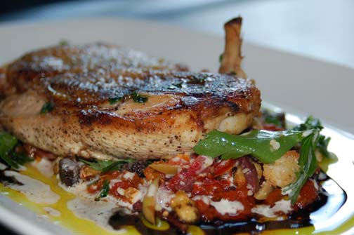 Make a line on the plate with the melted tomato. Top it with the pumpernickel panzanella. Drizzle parmesan cream over and around the tomato and pumpernickel panzanella. Place the crispy chicken halve on top of it. Serve.
