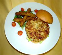 Slice plum tomatoes in halves and set aside for service. Place butter in a medium heated sauté pan. Place shrimp patty in sauté pan and cook until golden brown on both sides, then finish in a 350° oven. It will take about 15 minutes.