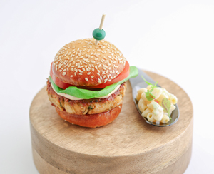 Heat pan and sear crab cake on both sides. While crab cake is cooling, toast slider bun. Assemble each by placing Old Bay agile onto bun with crab cake, le<uce and tomato.
