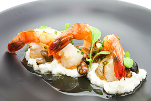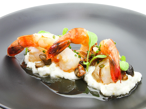 Plating: Place 3 oz. of grits, 3 jumbo shrimp, 2 tbsp. of mushrooms, and 1 tsp. of warm pancetta vinaigrette over shrimp. Enjoy.