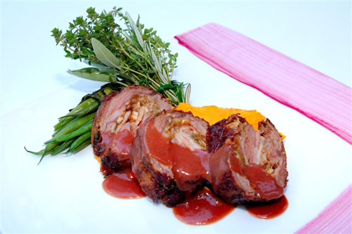Preheat oven to 375°. Slice the lamb butterfly style (sliced in the middle but still hinged on one side). Spread the mushroom duxelle evenly in the middle and top with the slices of speck. Roll the sides of lamb back to original resemblance. Using butcher's twine, tie the lamb so it will not open up during cooking. Quickly sear the lamb (on all sides) in a skillet. Place the lamb in a pre-heated oven for about 18 minutes (for a "medium" temperature finish). Once ready, slice each loin in 8 slices and accompany with sauce.