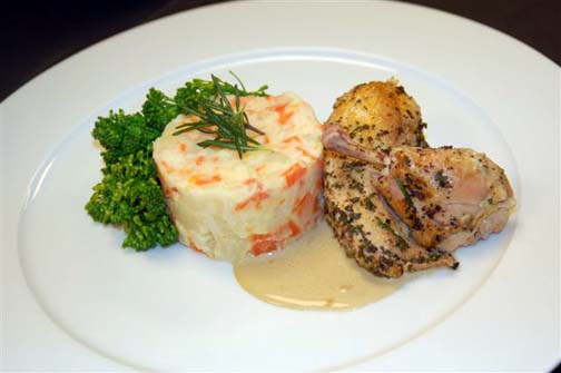 Place poussin in plate. Serve with porcini cream sauce, root vegetable mash and broccolini or your favorite vegetable.