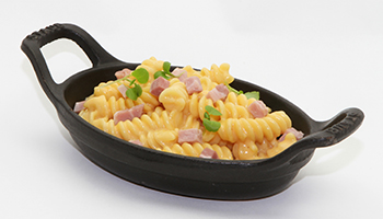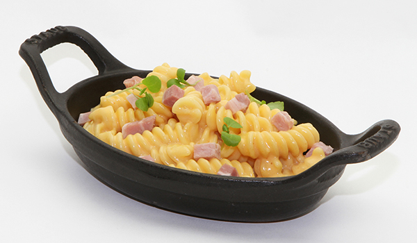 Chipotle Mac N Cheese Preparation: Mix chipotle cheese sauce with cooked fusilli pasta and top with cubed Adobo pork.