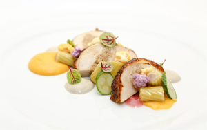 sweet potato puree, chestnut stuffed rigatoni, porcini mushroom cream sauce, and cranberry