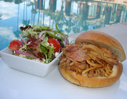 In a sauté pan at medium heat add 1 cup of pulled pork and ½ cup BBQ sauce, heat for 5 min. stirring twice. Put a brioche bun on plate with the BBQ pork, then put the salad on the plate and garnish salad with a sprinkle of feta cheese.