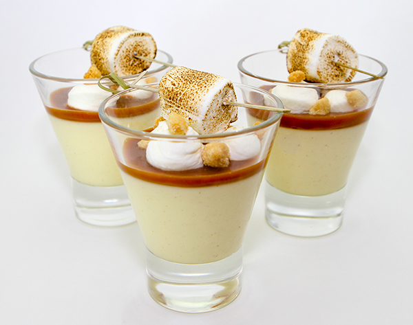 Assembling Panna Cotta After the panna cotta has set, place cooled caramel sauce on top to cover the top of the panna cotta. Pipe whipped cream in a rosette on top of the caramel sauce. Sprinkle some of the crumble on top of the whipped cream and place the toasted marshmallow on top.