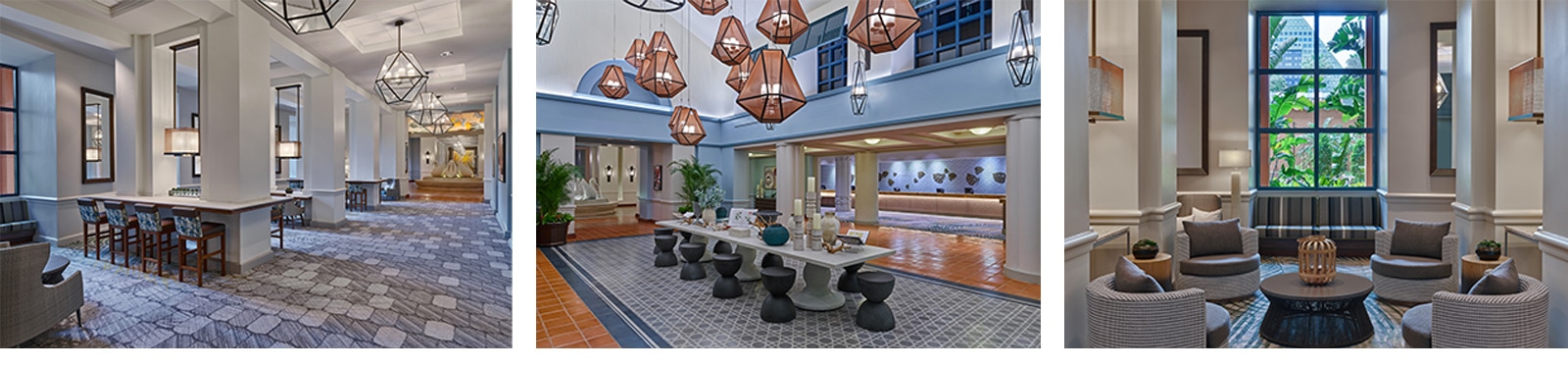 Enhanced lobbies provide guests with an immediate and renewed sense of arrival. The new Dolphin Resort lobby features a contemporary look with a new geometric ceiling, enhanced lighting and a grand chandelier stretching 20 feet from the ceiling with nearly 1,000 strands and about 10,000 individual crystals suspended above the Dolphin fountain. Special attention was given to the resort entrances to create a memorable first impression, and a strong color palette was chosen to convey a sense of awe.